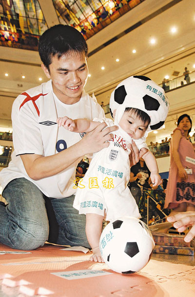 世界盃賽正進行得如火如荼,又適逢一年一度的父親節,趁世界盃熱潮席捲全城,商場各出奇謀。圖左為有商場特別舉辦全港最大型的父親節世界波親子活動—全港BB球王爭霸戰。近500對父子報名參加,當中挑選100對BB與父親參賽,以鬼馬有趣造型上陣射龍門。圖右為有商場邀請20多位孿生兒,在約100個足球上寫上他們對父親最誠懇的祝福。