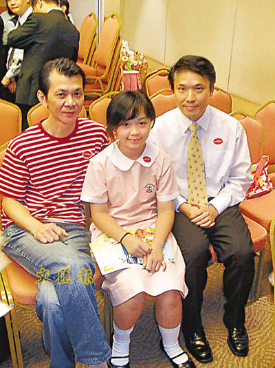 ■廖智妍(中)年紀小小,已懂得健康飲食,吃雞先脫雞皮。旁為她的父親(左)及就讀學校候任校長梁步青。 本報記者李玉儀 攝