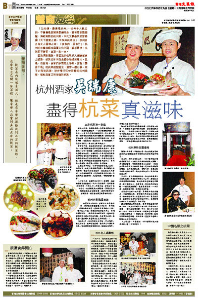 2005年4月,杭州酒家正式開業,打正招牌,做正宗杭菜,迅即名揚香港。從商界大亨到政界名流,從影視藝員到專欄作家,紛紛慕名而來,本港各大報章也爭相推介。