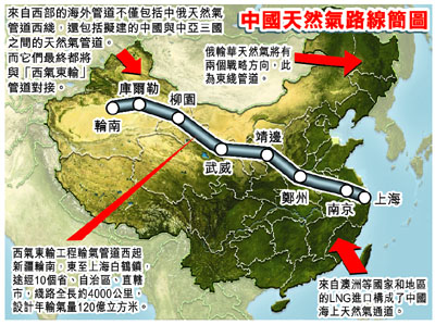 中國天然氣路線圖日前曝光。為了解決未來天然氣存在的巨大缺口,中國除了建成「西氣東輸」等多條天然氣「大動脈」外,同時通過海上通道啟動多項LNG進口項目,由澳洲等國家和地區輸入液化天然氣。此外,俄羅斯計劃分東西兩條管道對華輸出天然氣。而中國並擬建與土庫曼斯坦、烏玆別克斯坦及哈薩克斯坦三國之間的天然氣管道。