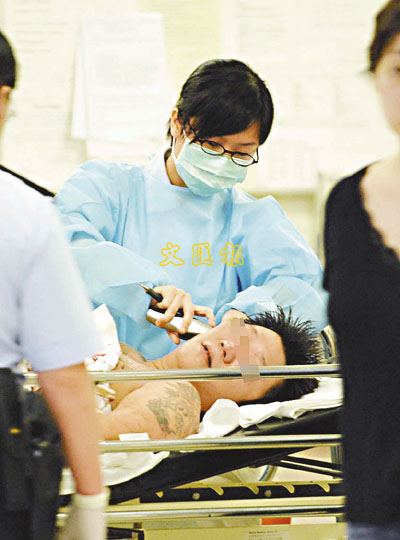【本報訊】油麻地街頭昨晨發生江湖喋血戰。兩名「十×K」雙花紅棍,與十多名有黑幫「和×和」背景的尼泊爾漢,疑因碰撞問題發生爭執、繼而分持鐵枝及利刀混戰;其間被巡至的警方衝鋒隊隊員發現,惟當警員立即下車制止時,竟遭一名尼泊爾籍兇徒揮刀襲擊,一名警員睹狀,被迫拔槍示警自衛,終與前來增援的同袍合力將4名受傷黑漢拘捕。