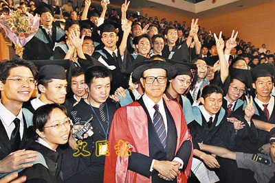 ■李嘉誠與汕大畢業生合影。 資料圖片
