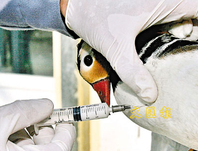 ■英國兩名技術人員做實驗時,意外被沾有H5N1病毒的針筒刺傷。圖為技術人員為禽鳥注射疫苗的情形。 資料圖片