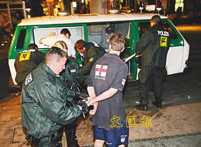 英國「流氓」球迷在歐洲各國十分「出名」,但英格蘭國家隊最近在德國科隆、紐倫堡、法蘭克福作賽,球迷卻出乎意料地平靜。世界盃目前為止3,842名被拘捕的球迷中,只有135名英國球迷。 ■綜合外電消息
