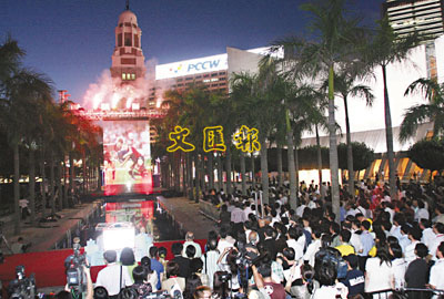 ■首個亞洲晚間舉行的多媒體水幕匯演「光影水躍」,是「2006香港購物節」主打節目之一。本報記者潘政祁 攝