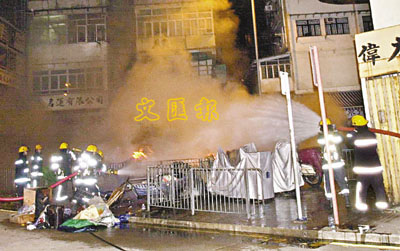 ■界限街存放路旁的一批竹製品被人縱火,現場火光熊熊濃煙密佈,消防員開喉灌救。