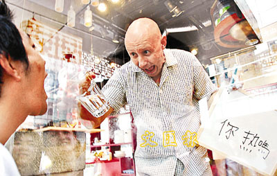 ■上海一向是內地外來文化匯演的舞台。圖為6月20日,在上海新天地,一名行為藝術表演者向玻璃屋外的觀眾「灌水」。