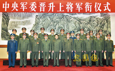 【本報北京新聞中心記者文翰、章鑫24日電】中央軍委24日在北京舉行晉陞上將軍銜儀式,軍委主席胡錦濤向10名獲晉陞上將的軍官頒發命令狀。據悉,該次晉陞上將的高級軍官中以政工幹部居多。根據以往慣例,解放軍現役上將編制人數在30名左右。截至2006年6月24日,共有164名高級軍官警官獲上將軍銜警銜。
