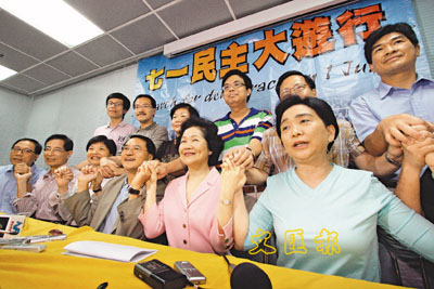 【本報訊】(記者 鄭治祖)前政務司司長陳方安生與反對派為「谷」市民7.1上街,昨日共同舉行記者會。面對媒體,雙方上演了一場心有不甘卻礙於形勢不得不虛與委蛇、互相利用的戲碼。