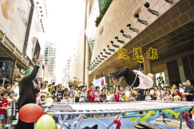 旺角首個大型街頭嘉年華「動感博覽會@砵蘭街」,昨日專誠邀國際知名組合「Crazy Tramp」的Rocky 與Andy,於砵蘭街街頭表演跳彈床,令人一新耳目,與色情場所集中的另一段砵蘭街紅燈區大相徑庭。不要以為他們穿著西裝會影響表演 ,其實他們仍能彈上幾米高,騰空做出多個高難度花式動作,給途人意外驚喜。本報記者潘達文 攝