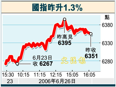 即月期指收報15,800點,升20點,低水5點,成交52259張;H股即月期指收報6346點,低水5點,成交17665張。港股全日沽空11.29億港元,涉及股份101隻,其中中國銀行(3988)沽空金額最多,涉資3.99億或佔35.3%。紅籌國企在金融類及資源類股份支持下造好,恆生國企指數報6,351.04點,升83.12點或1.33%;恆生中資企業指數報2,180.36點,升15.4點或0.71%。