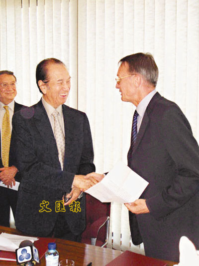 ■何鴻燊(左)及鄧禮寶共同簽署協議。本報記者王海濤 攝