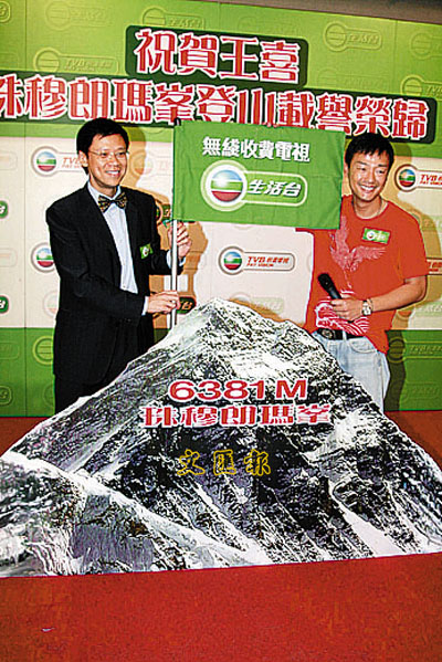 【本報訊】(記者 許紹基)王喜早前參與由新華社及中央電視台等籌劃的珠穆朗瑪峰考察隊伍,勇闖六千三百八十一米的珠峰山腰;無線昨天特為他舉行記者會,王喜在會上除了提到自己的種種體驗之外,更加將無線收費電視生活台的旗幟還給電視廣播有限公司電視廣播業務總經理陳志雲。