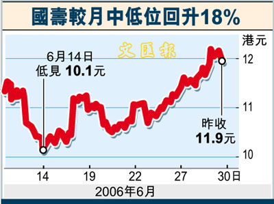 國企指數收報6,574點,升1.38%。中資金融股明顯受追捧,建行(939)升2.17%,收報3.535元;中行(3398)升0.73%至3.45元;國壽(2628)收報11.9元,升1.28%,三隻中資金融股成交各達22億元、20億元及13.6億元,位列成交第二至第四名。