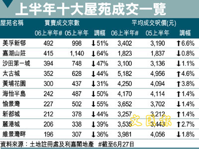 若以上半年十大活躍成交屋苑分析,所有屋苑的買賣登記量均顯著下跌,跌幅介乎31%至64%不等,其中嘉湖山莊更因為貨源流轉放慢的關係,令市場失去投資者的資金支持,導致上半年買賣登記量銳減64%至415宗水平,成為上半年買賣登記量跌幅最大的屋苑外,而其成交量排名亦由去年上半年的首位,下跌至目前第2位。至於客源向來廣泛的黃埔花園,亦在持續加息情況下流失相當上車及換樓客源,令上半年買賣登記量減少31%。