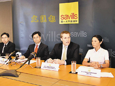■第一太平戴維斯袁志光(左二)表示,下半年一手樓價有壓力。本報記者周穎 攝