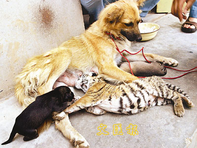 ■這隻陜西的幼虎被母親拋棄後,好在得到這隻好心的狗,以奶相送。何謂患難見真情,有圖給你看。(法新社)