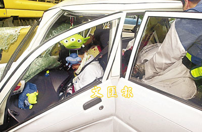 ■私家車迎頭狂撼泥頭車後,前座司機及後座女乘客當場慘死;另兩名女乘客則重傷昏迷。