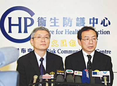 ■翁維雄(右)表示,中心正為近期的諾沃克病毒作基因排列,初步顯示病毒的類型與以往不同。左為劉少懷。本報記者李見安 攝