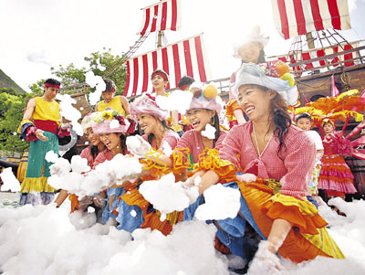 ■海洋公園夏水禮以加勒比海為題,讓遊人在漫天泡泡下玩樂。 本報記者高仲明 攝