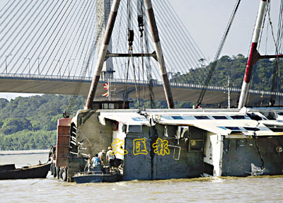 ■遭撞沉的珠海客輪「東區一號」被拖離現場。