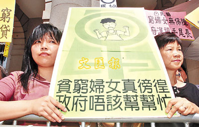 ■大批關注貧窮的婦女趁昨天立法會辯論婦女貧窮問題,手持標語到立法會門外抗議。本報記者李志樑 攝