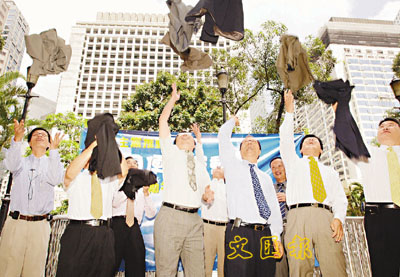 民主黨多名議員昨簽署《夏日便服約章》,鼓勵在辦公室工作者夏日不穿西服,避免調低空調度溫,節省電力,以支持環保。 本報記者李志樑 攝