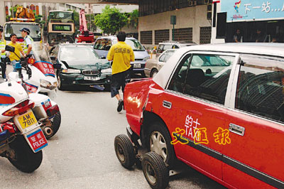 【本報訊】青山公路一宗交通意外,竟揭發肇事的士竟是失車。一名偷車賊月前在沙田偷走一輛的士後,竟掛上假車牌大做其無本生意,昨午偷車賊載著3名男女途經青山公路近關門口街燈位等候轉燈時,被尾隨一輛私家車失控猛撞,導致兩車6人受傷,惟的士司機竟取走證件及錢包棄車逃去,警方到場調查才知的士是失車,正追緝在逃的士司機下落。