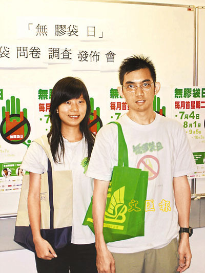【本報訊】(實習記者 楊廣)推行了2個月的「每月無膠袋日」漸見成效。綠色學生聯會於上周二無膠袋日進行的問卷調查發現,超過7成受訪市民已開始養成減用膠袋的習慣,另有近7成人於平日亦會自備購物袋,結果較6月為好。聯會主席何漢威表示:「長遠希望每星期舉辦一次無膠袋日,令市民養成自備購物袋的習慣,適應政府將來推行的膠袋收費政策。」