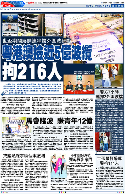 上月底,澳門警方亦根據香港提供的情報,在澳門搜查5處懷疑經營非法賭波的地點,共拘捕19人及檢獲總值約4億元的波纜。澳門警方在世界盃期間,總共搗破了7個非法賭波集團,拘捕24人。