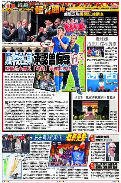 【綜合外電】比意大利4度奪得世界盃更為矚目的「施丹頭頂馬特拉斯被逐」事件出現新進展,被指出言挑釁法國「球王」施丹在先的意大利後衛馬特拉斯,首認曾以侮辱性的說話「回敬」施丹,但並未斥對方為「骯髒的恐怖分子」或帶有任何種族歧視的說話。可是當被問到言語間有否提及對方的家人,馬特拉斯則借意回避未有提及「母親」二字,惹人懷疑。身在阿爾及利亞的施丹兄長及堂兄弟則齊聲支持施丹。究竟馬特拉斯說了甚麼,令一代球王落得如斯下場?也許要留待施丹本人於日內交代事件了。