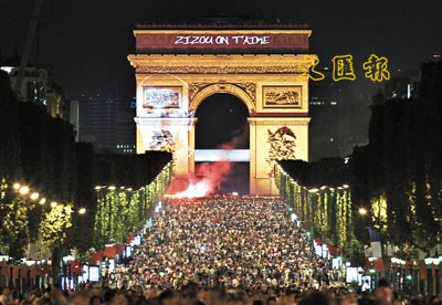 ■凱旋門上一句「我們愛施丹」的標語,足見紅牌無改球迷對他的愛戴。法新社