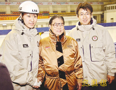 ■霍震霆(中)與香港運動員韓月雙(左)在長春滑冰館合影。新華社