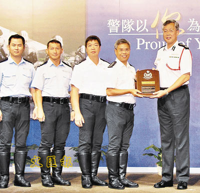 ■警務處處長李明逵(右一)嘉許25名警員及18個警隊單位,表揚他們在世貿會議期間的表現。圖為一哥向警隊護送組頒發嘉許盾。本報記者陳朗昇 攝