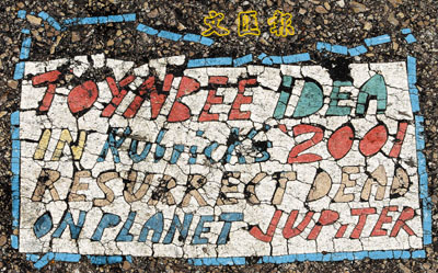 以美國聖路易斯市中心為例,被嵌進街道的牌匾刻上:「湯因比於寇比力克的《2001漫遊太空》構思出死人在木星復活」字樣,但相信頭腦如何靈活的人都解不開上述句子的含義。