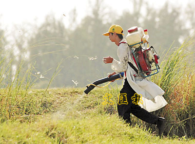 14日,由於近半年基本沒有降雨,海南樂東蝗蟲迅速繁殖。為此,中國熱帶農業科學院環境與植物保護研究所的工作人員在當地進行滅蝗行動。 新華社