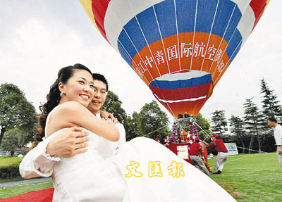 ■空中婚禮備受歡迎,一對新婚夫婦在熱氣球上度過最溫馨一刻。