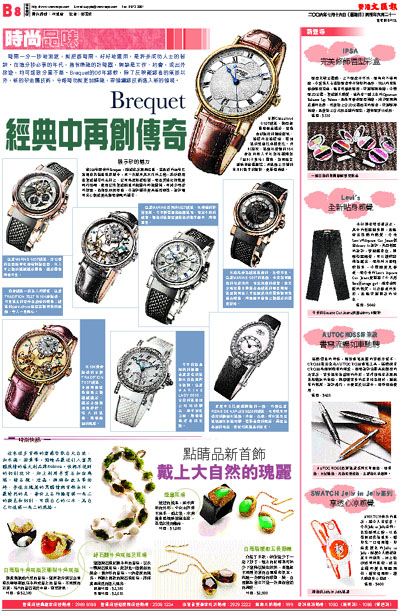 時間一分一秒地流逝,能把握時間,好好地運用,是許多成功人士的秘訣。在這分秒必爭的年代,擁有準確的計時器,無論是工作、約會,或出外旅遊,均可達致分毫不差。Brequet的06年錶款,除了反映戴錶者的氣派以外,新的矽金屬技術,令報時功能更加精確,帶領鐘錶技術進入新的領域。
