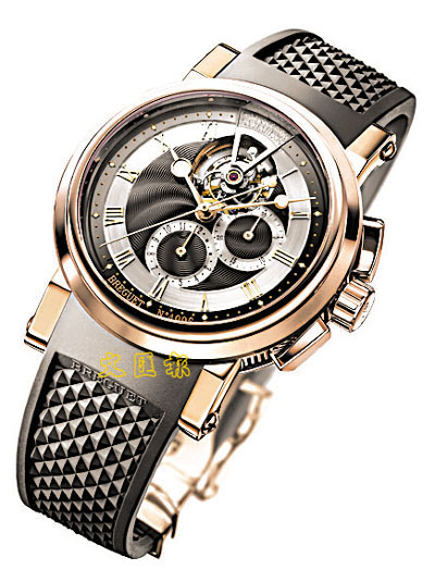 這款MARINE 5837腕錶,在12時的位置獨有陀飛輪調製裝置,以人手上鏈的機械機芯驅動,機芯躍動清楚可見。