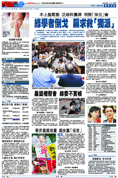 親綠學者籲扁下台行動昨日正式啟動。綠營高層預料,此舉將加速民進黨基本盤流失。為減緩衝擊,「總統」陳水扁除今天會見「獨派」大老外,也將在周一邀集「中央」與地方黨政要角舉行黨內大會,凝聚支持,鞏固權力。而學界發起的倒扁動作,亦引來挺扁本土社團的紛紛反彈。台媒分析,環繞阿扁攻防的兩股力量料將全面攤牌。