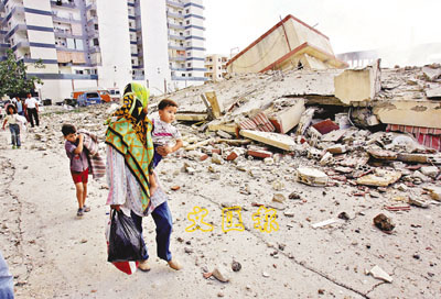 ■以黎衝突加劇,中國駐黎大使館已安排中國公民前往鄰國敘利亞。圖中是一名黎國婦女攜兒女撤離被毀的家園。 法新社