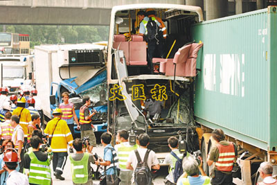 【本報訊】繼上周末屯門公路一輛貨櫃車失事墜坡,奪去司機性命後,葵涌道昨晨又發生嚴重車禍。一輛雙層九巴狂撼一輛路中拋錨的貨櫃車尾,釀成3車「串燒」,巴士車頭及車身仿如「開罐頭」遭撕開,上層4名乘客像「炮彈飛人」般拋出車外,墮地重傷,另有12人浴血,分送3間醫院搶救,其中一人延至晚上死亡。警方稱肇事3車司機均通過酒精呼氣測試,正循多方面(包括是否有人超速或打瞌睡)調查意外原因。