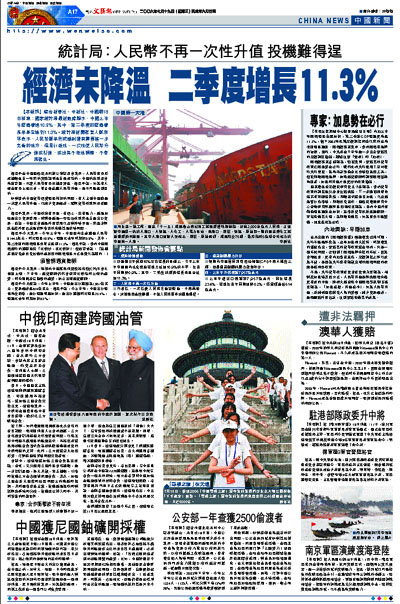 【本報訊】綜合新華社、中新社、中國網18日消息:國家統計局最新數據顯示,中國上半年經濟增速10.9%,其中,第二季度的經濟增長率甚至達到11.3%。統計局新聞發言人鄭京平表示,人民幣匯率形成機制還有需要進一步完善的地方,但是行政性、一次性使人民幣升值或貶值,或出其不意地調整,不會再發生。