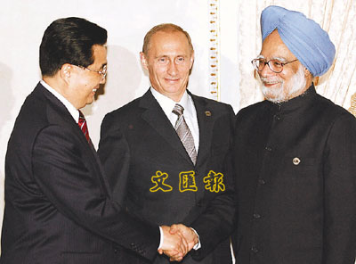 當日,中國國家主席胡錦濤與俄羅斯總統普京、印度總理辛格會晤,就加強三國合作交換意見,胡錦濤表示,中俄印在國際事務中有重要影響,應深化三方戰略合作。