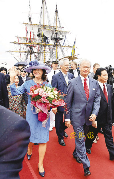 【本報珠三角新聞中心記者唐苗苗、實習記者解玲廣州18日電】今天中午,航行了9個半月的瑞典仿古帆船「哥德堡號」緩緩駛入廣州南沙客運碼頭,瑞典國王卡爾十六世.古斯塔夫和王后西爾維婭一行在鮮花簇擁中走下船,受到廣州政府及人民的熱烈歡迎。
