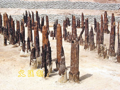 經考古發現,楔入原皂河河床的木柱5排,共160根,這些木樁,根根挺立,基本處在原始位置,露出的高度0.3-2.6米。這些木樁的木質相當堅硬,推測是黃楊木、香樟木、楠木等珍貴木種,目前有關專家正在對木樁成分進行鑒定。
