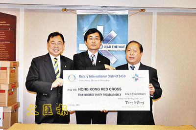 日前進行支票遞交儀式,國際扶輪3450地區總監黃昭文及上任總監尹錦滔將港幣23萬的善款支票交予香港紅十字會秘書長陳啟明。黃昭文在儀式後表示:「國際扶輪社社員一向關注人道救援工作,為苦難的人士伸出援手。對於是次巴基斯坦大地震造成巨大傷亡,3450區亦即時為災區籌措善款。我們希望盡一點綿力,讓災民盡快重過正常生活。」