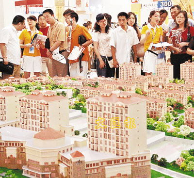 ■日前,2006大連夏季房交會在大連世界博覽廣場拉開帷幕,參觀者十分踴躍。本屆房交會以「平衡供求關係,抑制房價上漲」為主題,總展出面積達18,000平方米,分佈於大連市內各區的商品房參展樓盤50餘個。圖為參觀者在大連夏季房交會參展樓盤前諮詢。 新華社