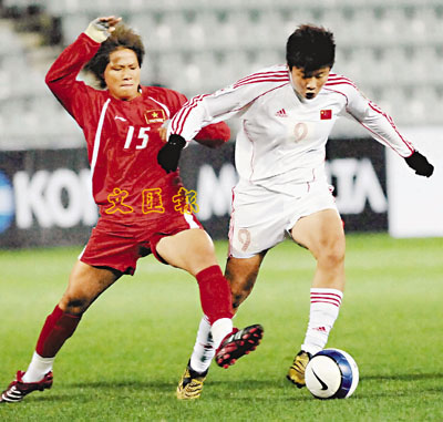 ■中國女足球員馬曉旭(右)與越南球員拚搶。 新華社