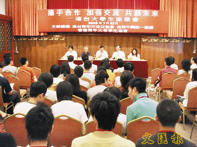 【本報訊】近百位港台大學生昨日齊聚在中華總商會大廈禮堂,舉行主題為「攜手合作 加強交流 共創未來」的座談會,大家普遍認為,港台大學生雖然學習和生活的環境不同,但彼此應該加強交流與合作,取長補短,將來要攜手並肩,求同存異,共同建設大中華。